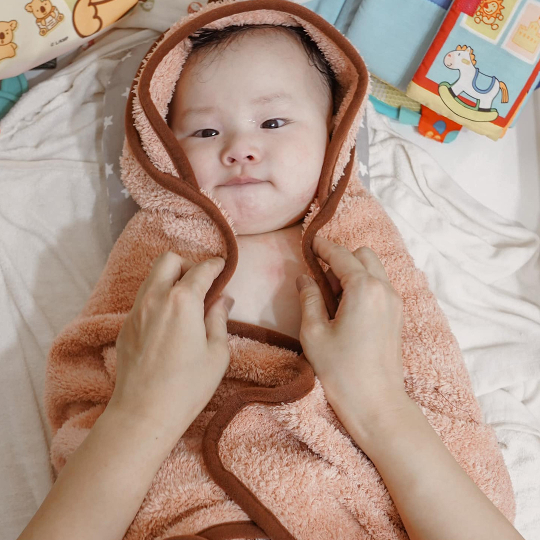 柔軟材質,吸水力很強耶,洗澡後擦乾頭髮、身體的好幫手