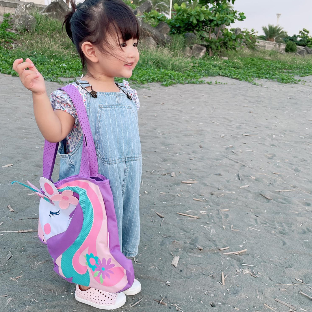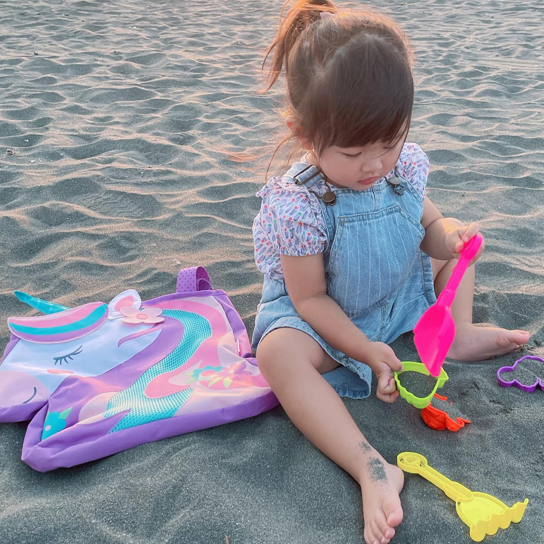 獨角獸收納包附挖沙工具5件組,收納包內側是網狀設計,可以在收拾好玩具後,可將多餘的沙子抖出,有了新收納包,以後晞晞玩具就可以自己背囉👍🏻。