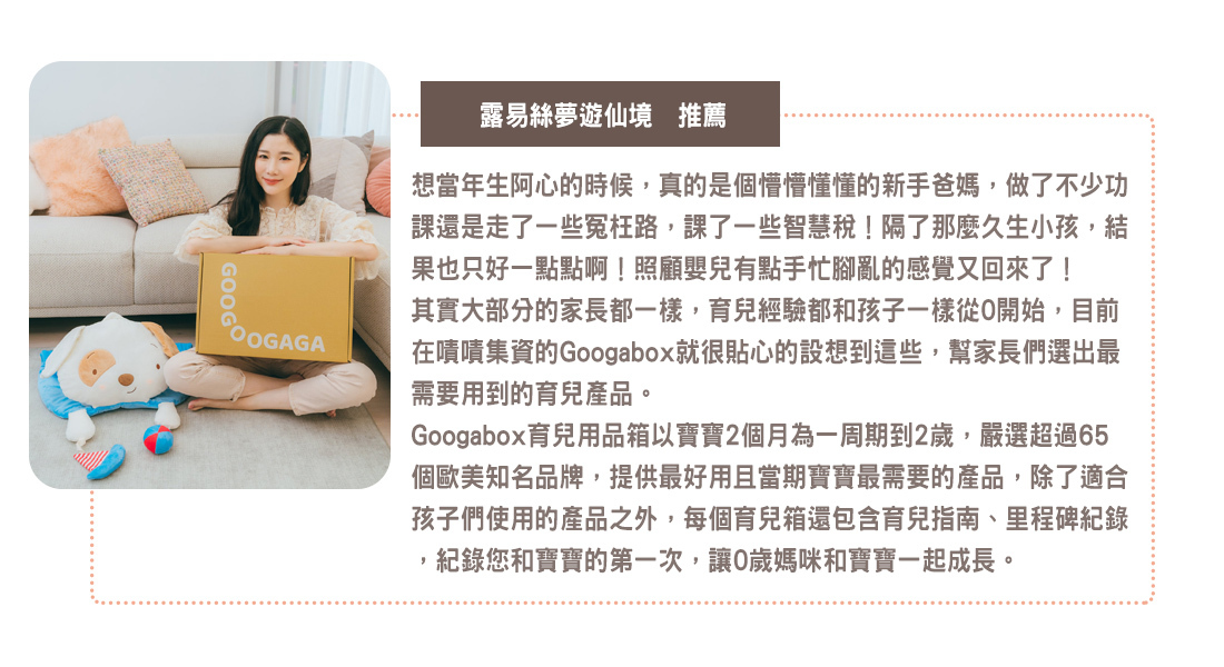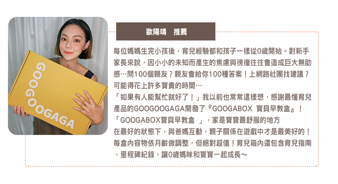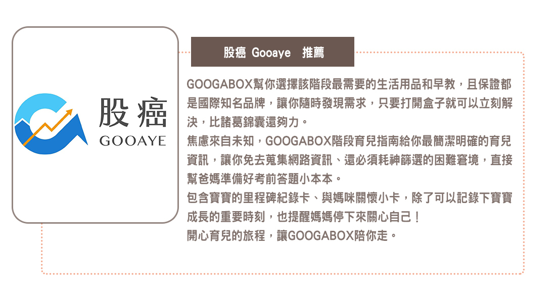 在成為母親的這段旅程上,是沒有任何一本書、一個人、甚至一堂課,可以幫媽媽解答所有問題的。在我們迎接新生命的同時,也曾面臨徬徨與無助,也曾感到崩潰。因此在我們靠著辛苦的摸索,走過這段育兒天堂路後,我們更想把這段慘痛的經驗化作力量,希望可以幫助每一位跟我們一樣的新手媽媽,可以少走一些冤枉路、多一些笑容、多一點支持與陪伴。於是我們創立了Googoogaga。「Googoogaga」取自小寶寶牙牙學語、想與媽媽對話而發出的咿咿呀呀聲響。象徵新生命帶來的新希望,讓每一位母親在聽到Googoogaga時,能想起孩子第一次發出聲音的感動。而GOOGABOX正是在這樣的期許中誕生的。