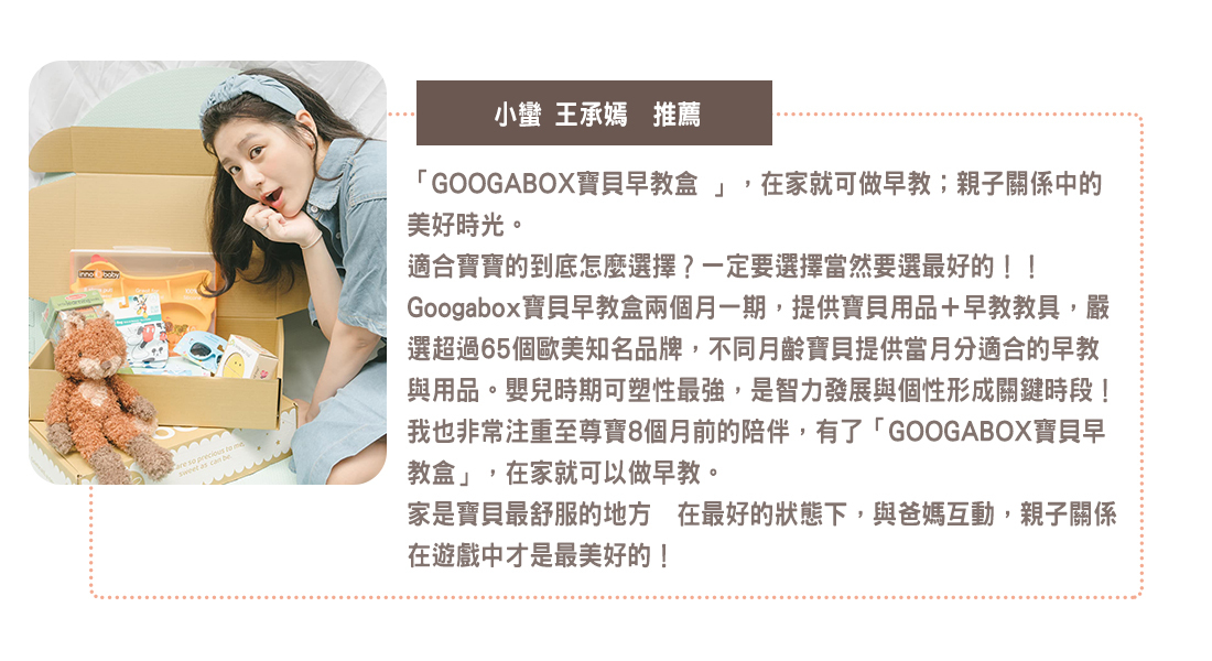 GOOGABOX從寶寶成長出發,從睡眠、用餐、早教學習、開心玩樂等四大方向進行選品,精選出下兩個月,階段性所需的生活必需品、早教/互動玩具…等。GOOGABOX盒內的產品嚴選超過65個國際知名品牌,保證讓您收到的,都是時下最夯、最值得擁有的必備品,從容面對接下來兩個月的挑戰,放心養寶寶!